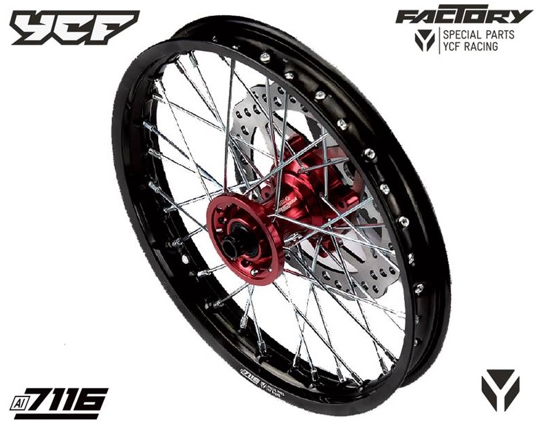 - Kompletní přední zesílené kolo 1.4x14", CNC náboj, pevnostní hliníkový ráfek 7116 pitbike YCF Červená